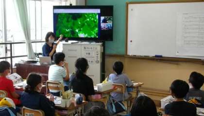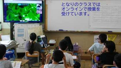 2組で先生は今日の学習のめあて等の確認をしています。その様子はZOOMで隣のクラスにオンライン配信しています。音声とともにプレゼン画面が同時に配信されています。