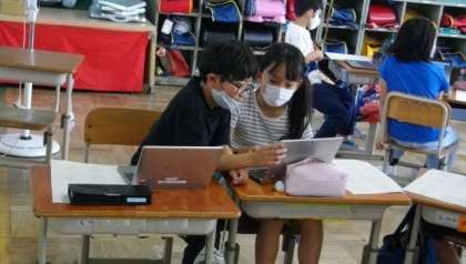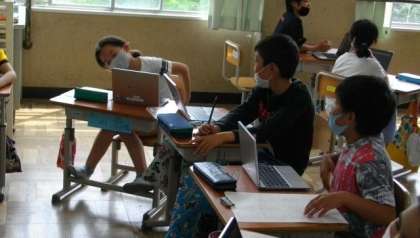 4年生は,社会科の時間に都道府県について調べたことをタブレットのプレゼンテーションアプリを使ってまとめています。今日は,それぞれがまとめたことを発表する時間です。