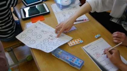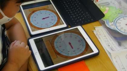 タブレットでは,指定の時刻を示した時計を組み立てるアプリを使っています。