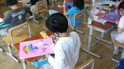 今日は「こんなふうにわれるといいなあ」ということで,はさみを使って思い思いの割れ方を表現しています。ジグザグに切ったり真っすぐにきったり曲線できったりと,ストーリーの中で思いを巡らせて制作しています。