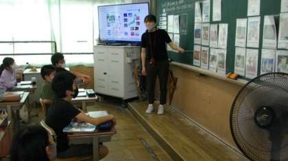 6年生の外国語科の学習の様子です。本単元では学習の「ふりかえり」をタブレットのロイロノート・スクールを使って行うので,学習が始まるときに机上にだしています。