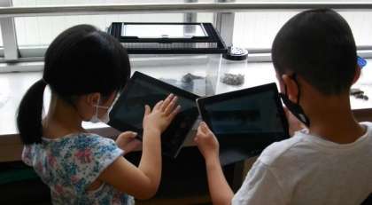 2年生の生活科では,タブレットのロイロノートスクールを使って「いきものしょうかカード」をつくりました。発表の練習をしています。