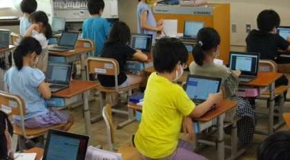 3年生は,習ったばかりのローマ字を使って,タブレットでタイピングにチャレンジしています。