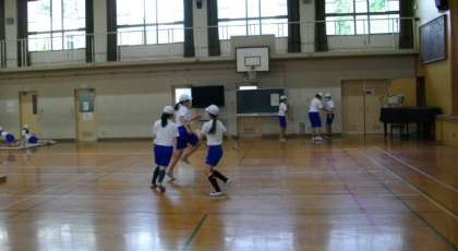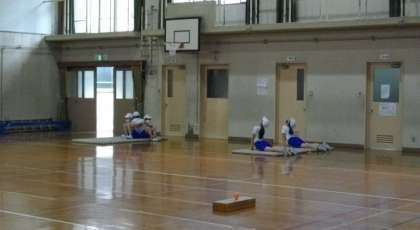 6年生は体育館で体育の学習中です。いろいろな動きを工夫しています。