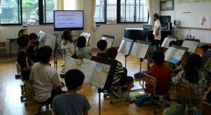 4年生は音楽で,音符の示す長さに合わせて手拍子をうっています。2年生は生活科で,まち探検のふりかえりをしています。