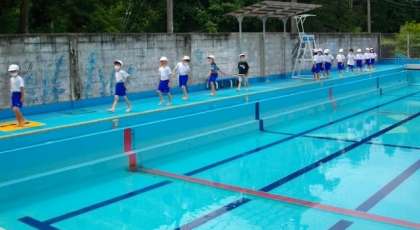 1年生は,来週から始まる水泳学習に向けて,プールにはいる練習をしています。