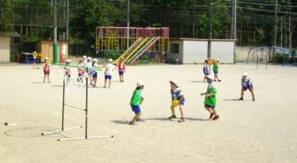 3年生は,ジャンボリングゴールを使って,ゲームを楽しんでいます。