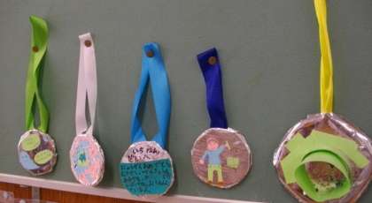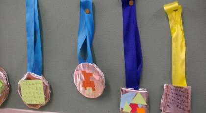 1年生教室の後ろに,素敵なメダルが飾ってあります。
