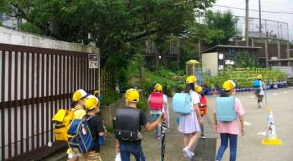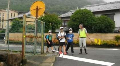 北側から登校してくるこの4人のお友達は,毎日,安全帽をきちんとかぶり,にこやかに「おはようございます」ときもちのよいあいさつをしてくれます。