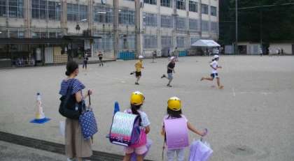 登校してきたお友達が,「がんばれー」と応援をしています。