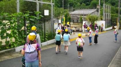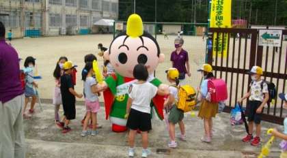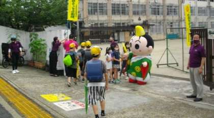 京の社明君が校門前で子どもたちを迎えてくれました。