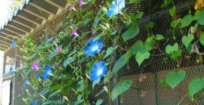 うさぎ小屋壁面には,すずしげな朝顔がさいています。