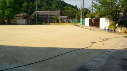 (なお,体育開放施設事業等で,運動場に駐車される際は,可能な限りウサギ小屋前にお願いします。運動場中央には,テニスコートがあります。全面を毎日曜日にはグラウンドゴルフで使用しています。競技用のトラックについては,専用ピンでビニルの白帯を打ち込んでいますので,無理な力が加わりますと,白帯が切れるなど,コンディション上不具合が起こる可能性があります。