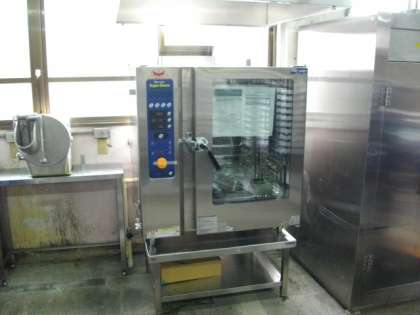 給食室に,「スチームコンベクションオーブン(スチコン)」を設置していただきました。スチコンは熱風を対流させたり蒸気を発生させたりすることができるので,釜では作れなかった「焼き物」にも対応することができます。また,下ごしらえで使うことで,栄養素の流出を防いだり食感や味わいを良くしたりすることにも効果が期待できます。