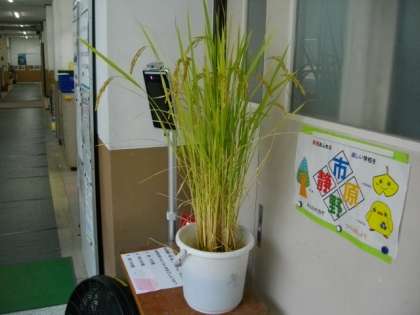 廊下を通る子どもたちが,立派に実った穂をじっと見ています。