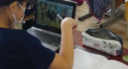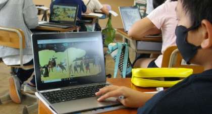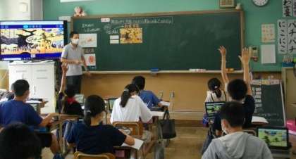挿絵からわかったことや考えたことを発表するために,各自のタブレットで図を詳細に観察しています。