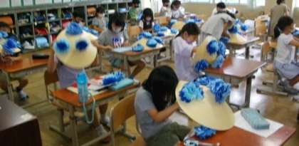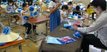 2年生は,演舞で使う笠に,花を取り付けています。