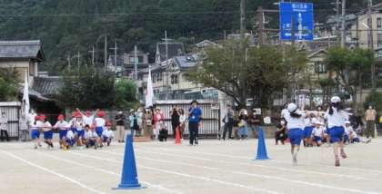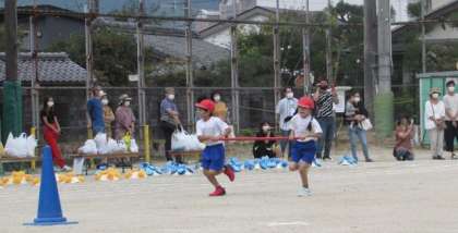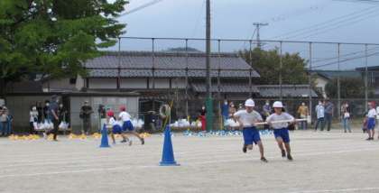 2年生の団体競技「まわってまわってかけぬけろ」が始まりました。