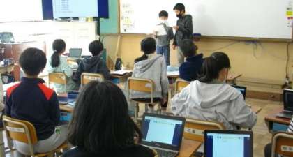 5年生は,英語で先生方にインタビューをして,その答えをもとに「先生クイズ」をつくりました。「バレーボールが得意な先生は何先生でしょうか。」「リコーダーの演奏ができる先生は何先生でしょうか。」