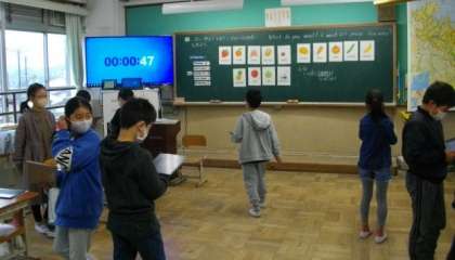 5年生は,理科で流れる水のはたらきについて,共通の資料からわかることを書きだしています。4年生は,外国語活動で,お気に入りのパフェを作るためにタブレットを見せ合って材料集めをしています。