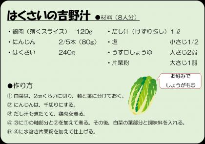 朝から雨が続き,気温もいつもより低く感じる今日の気候でした。そんな寒い日に心も体も温まる【吉野汁】が提供されました。けずりぶしからとったお出汁とともにスライスした鶏肉,これから旬を迎える白菜をともに煮ました。うまみたっぷりのお汁は子どもたちにも大人気でした。レシピを載せましたので是非ご家庭でもご賞味ください。