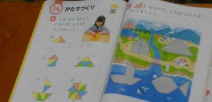 1年生は,算数の時間に,色板を使って「かたちづくり」の学習を進めています。