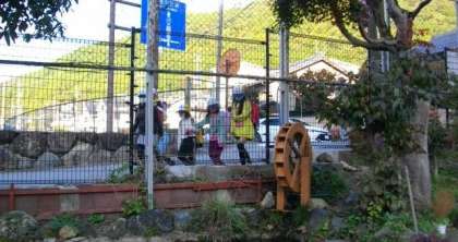 ゆっくりと動く水車を見つめています