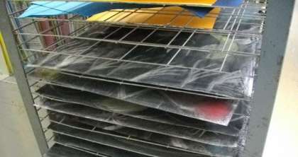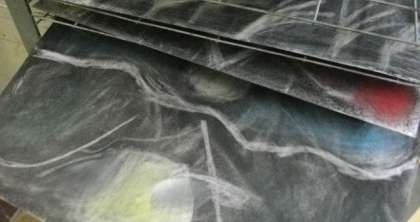 画用紙をコンテをつかって塗りつぶし,線状に消していく中でイメージを膨らませていきます。楽しい活動なのですが,結構手が汚れてしまうようで,授業後の洗面所前では,せっけんで手を洗っているお友達がいました。