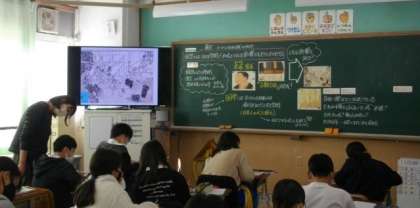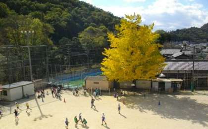 運動場では,3年生が理科の実験,6年生がサッカーをしています。  ↓