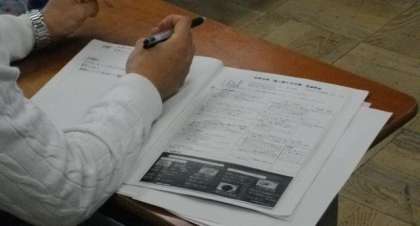 (後半は,「見やすい板書にするために工夫していること」に話が及び,それぞれが黒板を使ってチョークの持ち方や字の太さ,大きさ,筆圧,角度など,細部にわたって工夫していることを交流しました。)
