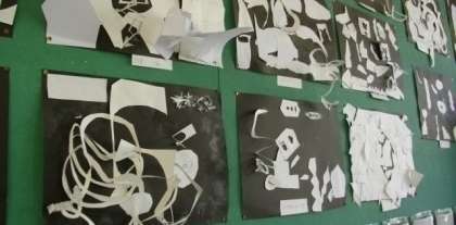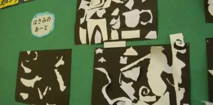 2年生の掲示板です。「はさみのアート」作品が掲示してあります。