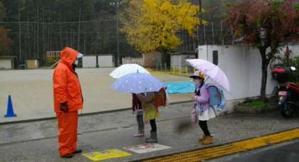 スクールガードリーダーの方が,早朝より地域の安全点検で校区内を見回っていただき,始業前には校門前で子どもたちに声をかけてくださいました。