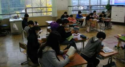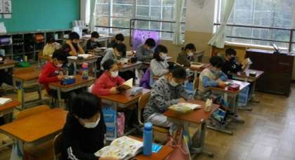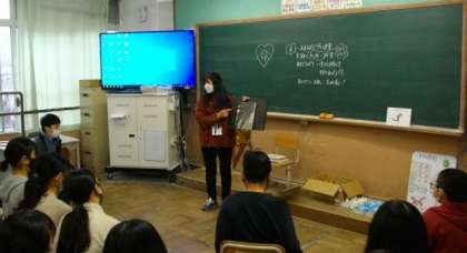 もみじ読書週間の取組で,静かな音楽が流れる中,読書を楽しんでいます。今日のブックトークは,6年2組で行いました。