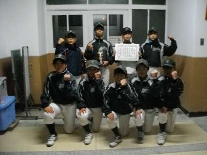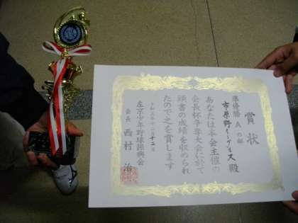 市原野イーグルスの皆さんが,先日開催された会長杯争奪大会Aチームの部で準優勝の栄冠を手にしました。今日は練習後に,賞状とトロフィーをもってご挨拶にきていただきました。