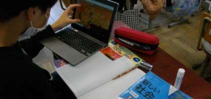 今日は資料をロイロノート・スクールのカードで閲覧して気づいたことを発表しています。(特に高学年では,机上にタブレット,教科書,ノート,筆箱を置いて学習することが,2学期に定着してきました。)