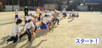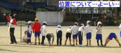 1年生が運動場で走っています。