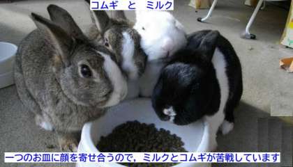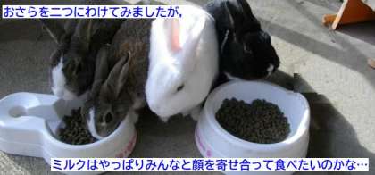 一つのお皿だと,顔を寄せ合うので食べにくいのかなぁを思って,二つのお皿に分けてみました。二つのお皿なので,半分に分かれて食べるのかなと思いましたが,なぜかミルクは,コムギとクルミのいる方へ行って食べようとします。(ですから,ゴマシオは,一つのお皿をずっと独占しています…)