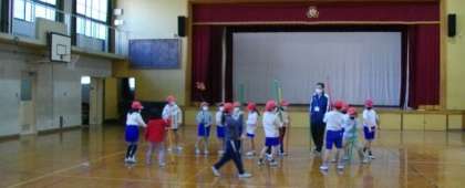 1年生は,「たぬきの糸車」を読んで,一言感想を発表しています。2年生は体育の時間で棒を使った体ほぐしの運動に取り組んでいます。