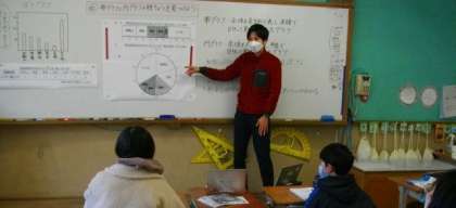 5年生は,算数で帯グラフと円グラフの特ちょうをみつけて発表しています。(1台はTeamsを使った授業の中継用のタブレットです。)