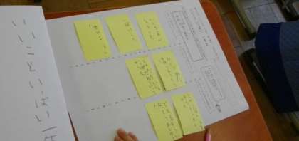 1年生は,楽しかった思い出を,作文に書きまとめていきます。今日は付箋紙を使ってその事柄を書き出しています。