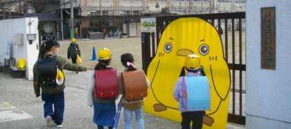 今日は「5」のつく日です。いつもならPTAの本部役員の皆さんが校門前で声をかけていただいていますが,集まることはせずに,各ご家庭の前で声をかけていただいています。今日は,「BIGいちたくん」(高さ180cm)が,子どもたちを迎えてくれました。