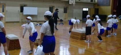 3年生は,跳び箱運動の準備運動をしています。跳び箱に両手をついて,ジャンプして