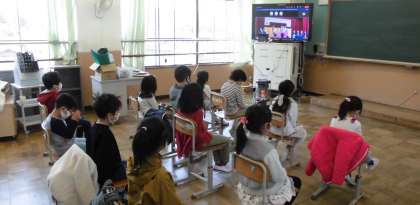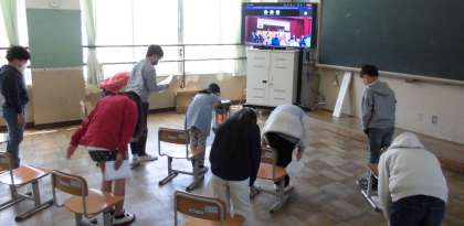 体育館で参列しているお友達といっしょに,教室でも起立や礼をしました。