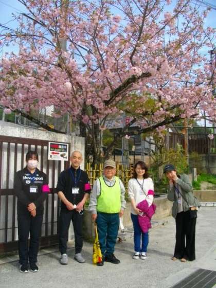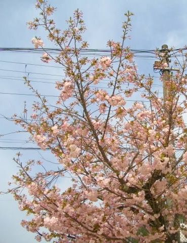 校門横の八重桜は八分咲きといったところでしょうか。今日・明日が,一番美しいと思います。