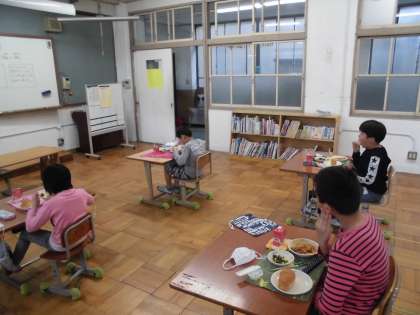 給食調理員さんにしっかりと「いただきます」と感謝の気持ちを伝えて食べていました。