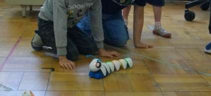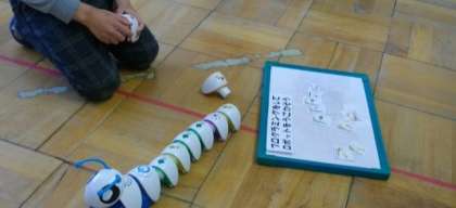 「まっすぐ」「右に曲がる」「左に曲がる」などのブロックを組み合わせて試行錯誤をしています。最初は思った通りにはなりませんが,どうすればいいのかを何回も試して最適解を求めていきます。