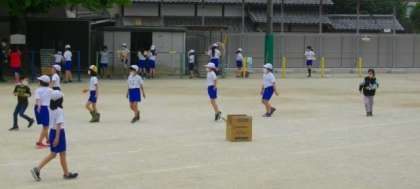 4年生は運動場で体育をしています。3年生は,理科でひまわりの発芽のようすについて意見交換をしています。