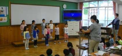 1年生を迎える会に向けて,ビデオどりのリハーサルをしています。