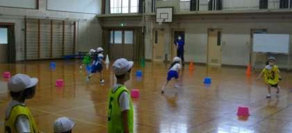1年生は,体育館でボールを使ったリレーをしています。