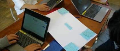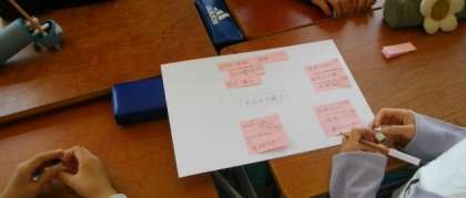6年生は,防災について学習をしています。今日は付箋を使って意見交換をした後,タブレットを使って調べています。
